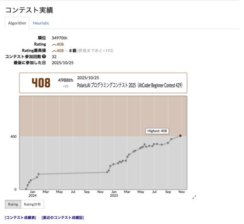 2025年10月25日、AtCoder Beginner Contest429でようやく入茶できました。 一応記録として記事を書いておこうと思います。 約1年がかりでようやく茶色なので、出来ない側の人間で凡人も凡人です。 それでも続けることでなんとかなりました。よかったです。 …